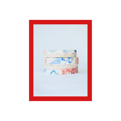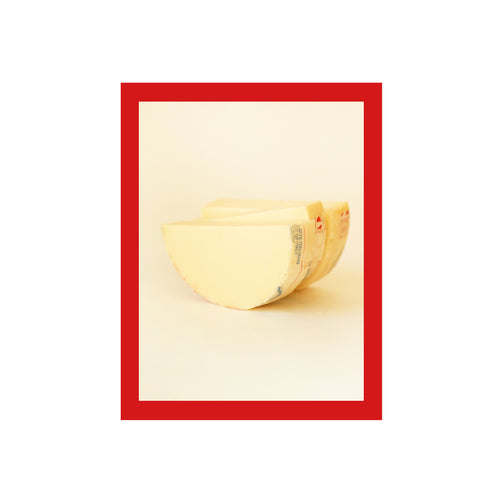 A set of two (2) postcard-sized magnets featuring photographs of provolone cheese made by Traianos Pakioufakis set within a thick red border.